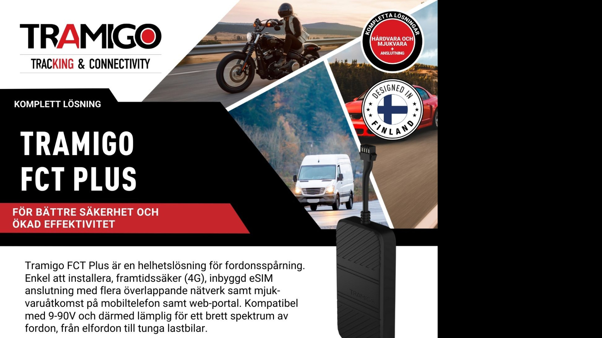 Tramigo FCT Plus är en helhetslösning för fordonsspårning. Enkel att installera, framtidssäker (4G), inbyggd eSIManslutning med flera överlappande nätverk samt mjuk-varuåtkomst på mobiltelefon samt web-portal. Kompatibelmed 9-90V och därmed lämplig för ett brett spektrum avfordon, från elfordon till tunga lastbilar.